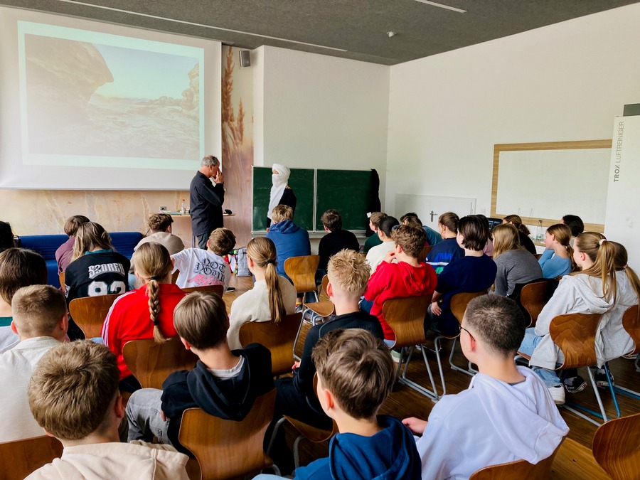 Mit Fotos von seinen Reisen nach Marokko und durch die Auswahl spannender Textstellen sowie durch Fragen an sein Publikum zog der Jugendbuchautor die Siebtklässler in den Bann der Romanhandlung, in welcher die vierzehnjährige Sarah, ein Großstadtmädchen aus Frankfurt, nach einem heftigen Unwetter plötzlich in der Wüste Sahara auf sich alleine gestellt ist und um ihr Überleben kämpfen muss.