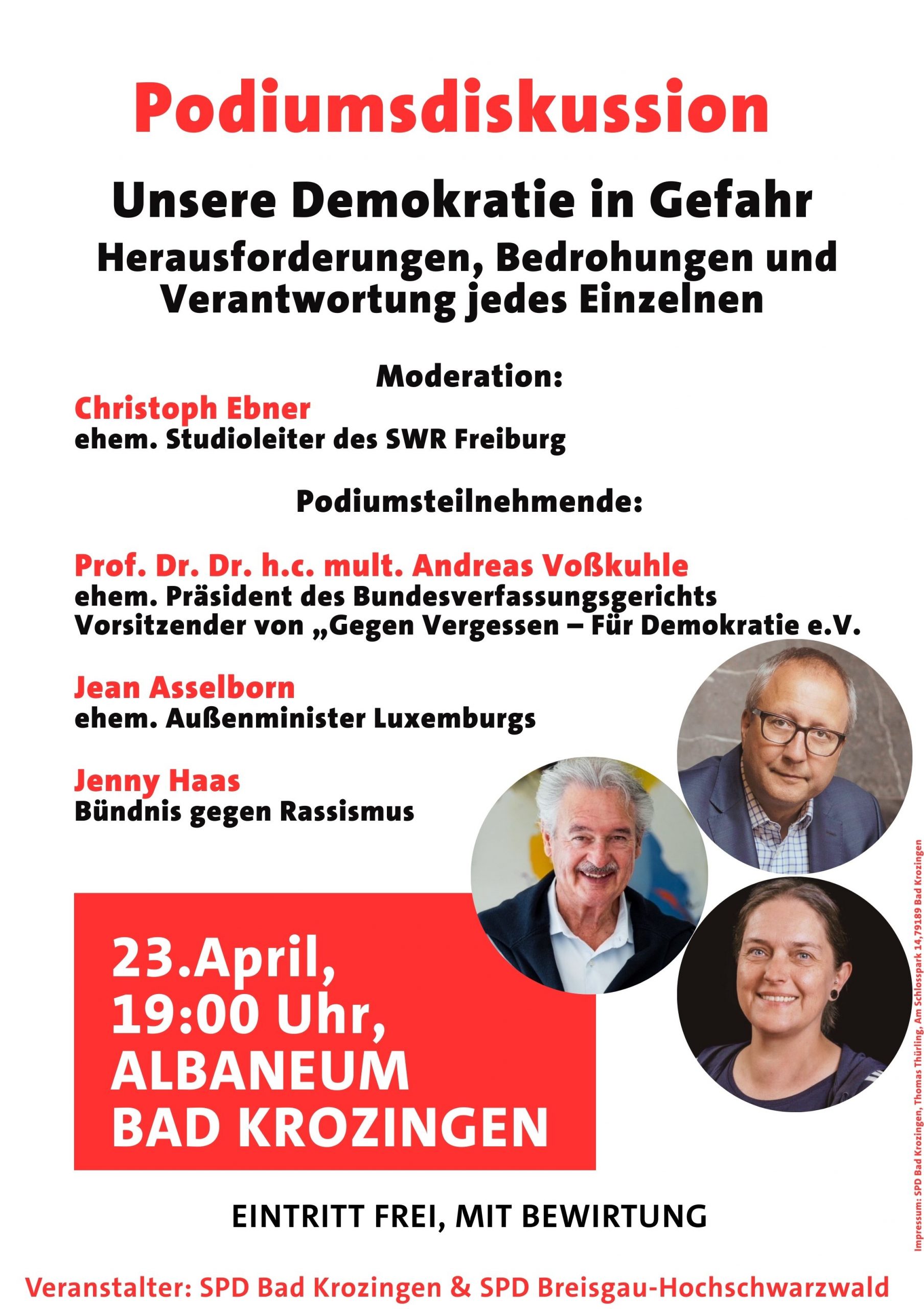 Der Politik-LK des MGMs besuchte dieser Tage die hochkarätig besetzte und mit ca. 350 Menschen extrem gut besuchte Podiumsdiskussion in Bad Krozingen zur oben genannten Frage. Andreas Voßkuhle (ehemaliger Präsident des Bundesverfassungsgerichtes), Jean Asselborn (langjähriger Außenminister Luxemburgs) und Jenny Haas (Bündnis gegen Rassismus) diskutierten, moderiert vom erfahrenen SWR-Journalisten Christoph Ebner, intensiv die Gründe für die Krise unserer Demokratie und Möglichkeiten, für diese beste aller Herrschaftsformen einzutreten. Besonders schön für den Politik-LK war, dass eigene Fragen, die im Vorfeld mit Herrn Ebner erarbeitet wurden, in den Abend eingeflossen sind.