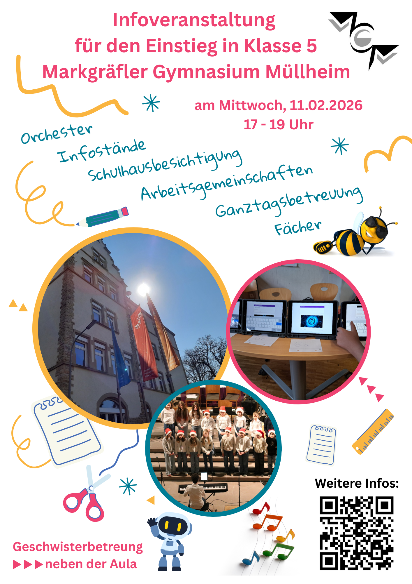 Am Mittwoch, 11.02.2026 um 17 Uhr laden wir Sie und Ihr Kind herzlich zum Informationsabend in unsere Aula ein. Neben zahlreichen Hausführungen in Kleingruppen, Infoständen und spannenden Aktionen in den Klassen- und Fachräumen bekommen Sie wichtige Informationen und Einblicke in die Konzepte des MGM.