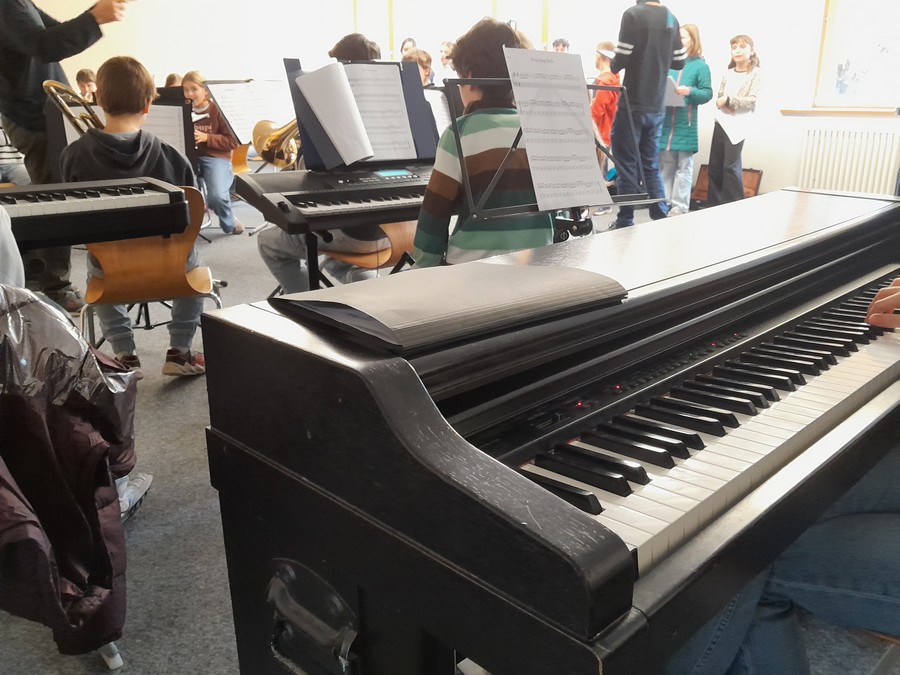 Bevor die Kinder zu Bett gingen, gab es zunächst einen inspirierenden Musikfilm („Die Kinder des Monsieur Mathieu”) und ein Versteckspiel im dunklen Schulhaus. Gegen Mitternacht war es fast überall ruhig. An dieser Stelle vielen herzlichen Dank an Katharina Lefèvre, die als weibliche Begleitperson einige heimwehkranke Fünftklässlerinnen auch mitten in der Nacht und am frühen Morgen mit Tee und Bettflasche sorgsam tröstete. Nach dem gemeinsamen Frühstück mit Brötchen sowie Kuchen- und Pizzaresten wurde noch zwei Stunden lang geprobt, vor allem ein gemeinsames Lied, das beim Weihnachtskonzert am 12. Dezember 2025 in der Stadtkirche vom Unterstufenchor und Unterstufenorchester aufgeführt wird.