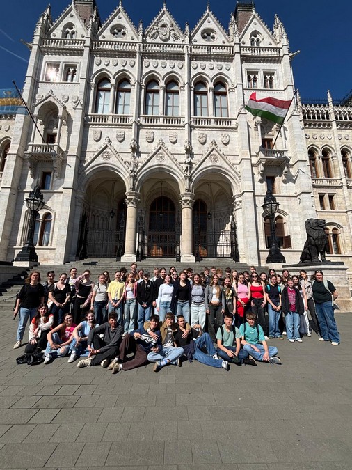 Unsere musikalische Gruppe mit knapp 60 Schülerinnen und Schülern aus den Klassenstufen 8-11 reiste in Begleitung von Frau Stängle, Frau Schuthof und Herrn Zambo, dem ungarischen Vater einer Schülerin, 16 Stunden mit dem Bus nach Ungarn. Das Hotel Camelot, in dem wir in dieser Woche untergebracht waren, liegt direkt an der Donau.
