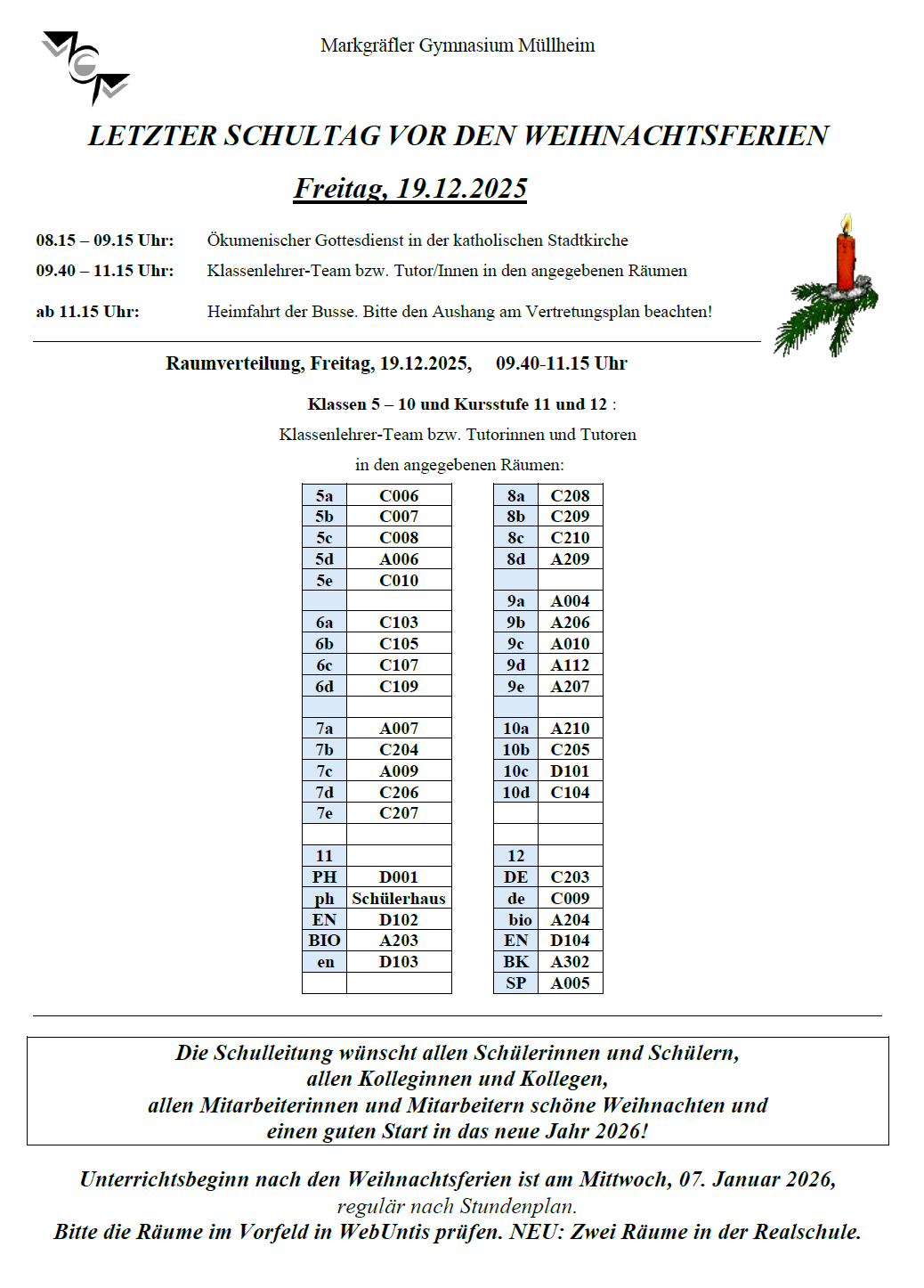 Der letzte Schultag vor den Weihnachtsferien, Freitag, 19.12.2025, beginnt mit dem traditionellen, ökumenischen Gottesdienst in der katholischen Stadtkirche Müllheim um 8.15 Uhr. Eine herzliche Einladung an alle Schülerinnen, Kolleg*innen und interessierten Eltern.