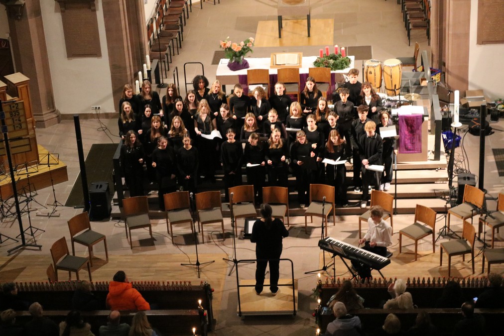 Einen wirkungsvollen Kontrast bildeten die engelsgleichen Klänge von Hark the herald angels sing, mit denen der Schulchor (geleitet von K. Schuthof) von der Kirchen-Empore aus seinen ersten, berührenden Auftritt hatte. Nach dem trostspendenden Lean on me hob der Chor mit On rising wind zum Anschluss erneut in himmlische Höhen ab und sorgte für einen der Höhepunkte des Konzerts.